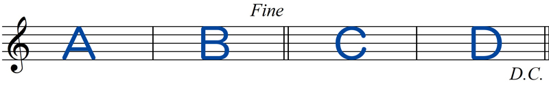 D.C.(ダ・カーポ)と書かれている場所まで演奏したら、曲の最初まで戻り、Fine(フィーネ)と書いてあるところまで演奏して終わります。