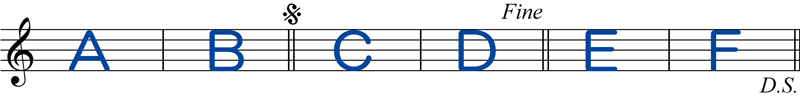 (セーニョ記号)まで戻り、Fine(フィーネ)と書いてあるところまで演奏して終わります。