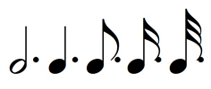 左から順番に、付点2分音符、付点4分音符、付点8分音部、付点16分音符、付点32分音符です。