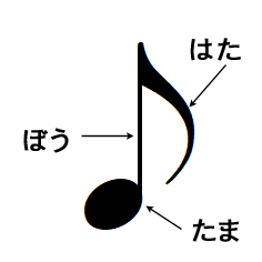 たまの部分は符頭、ぼうの部分は符尾・符幹、はたの部分は符鉤(ふこう)でした。