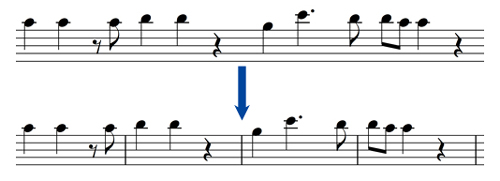 1段目と2段目は同じ音ですが、1段目は小節線を消してみました。